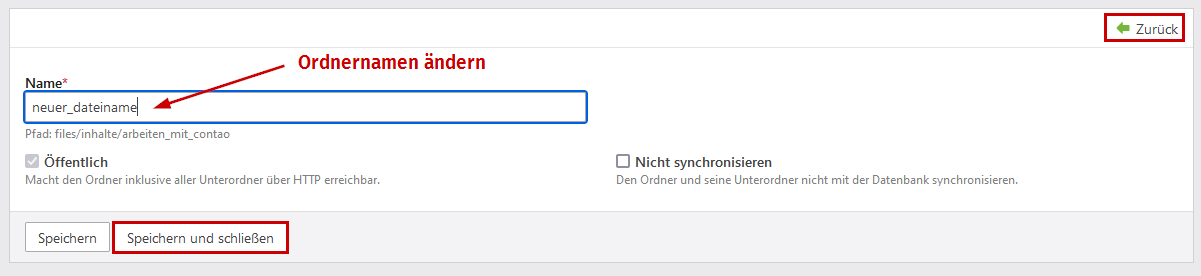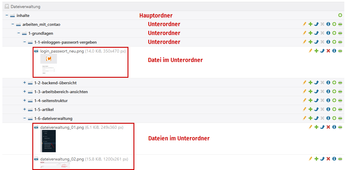 Zur Benennung der Ordner ist es empfehlenswert, keine Leer- und Sonderzeichen zu benutzen. Contao kann zwar damit umgehen, aber ein ftp-Programm bzw. der Webserver arbeitet ein bisschen anders und bei einem Zugriff per ftp kann die Darstellung dann unschön werden bzw. zu Problemen führen (Ordner/Dateien lassen sich nicht löschen u. ä.).